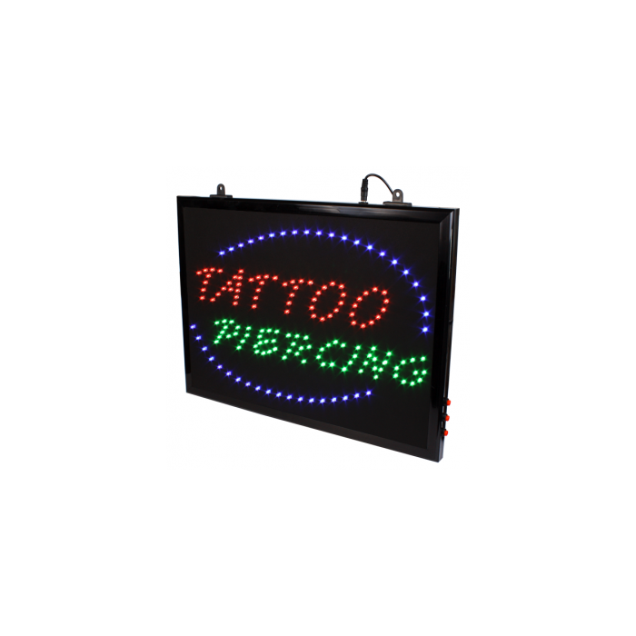 The tattoo and piercing LED sign can be hung up in your studio window to give your parlour that authentic touch! Comes complete with chain and plugs directly in to a mains socket with a lead approx. 1900mm long. The sign comes with four different settings: