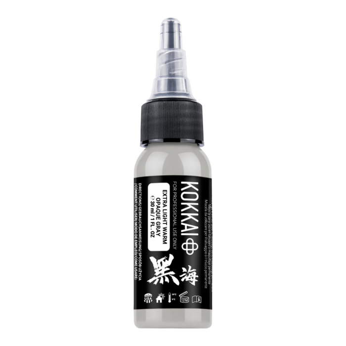 Enhance tattoos with Kokkai Sumi Ink in Extra Light Warm Opaque Grey, part of a 5-shade set designed to bring depth, warmth, and softness to your tattoos. Infused with white for a creamy opaque finish, these warm-toned greys are perfect for portraits, realism, black and grey work, and organic elements in designs.
