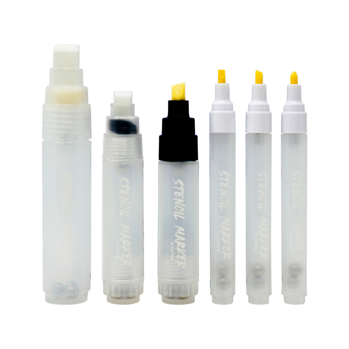 The empty marker pens can be filled with Nox Violet or Eco Stencil Ink for long-lasting stencils on the skin, and each pen type comes up with one replacement tip.
